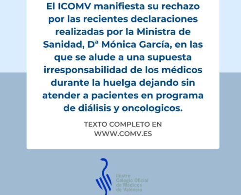 Desde el Ilustre Colegio de Médicos de Valencia, su Presidenta y la Junta Directiva desean manifestar su rechazo por las recientes declaraciones realizadas por la Ministra de Sanidad, Dª Mónica García, en las que se alude a una supuesta…