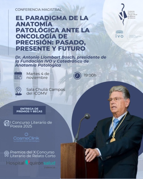 - Conferencia del Dr. Antonio Llombart Bosch, presidente de la Fundación IVO, bajo el título: “El paradigma de la anatomía patológica ante la oncología de precisión: pasado, presente y futuro“.