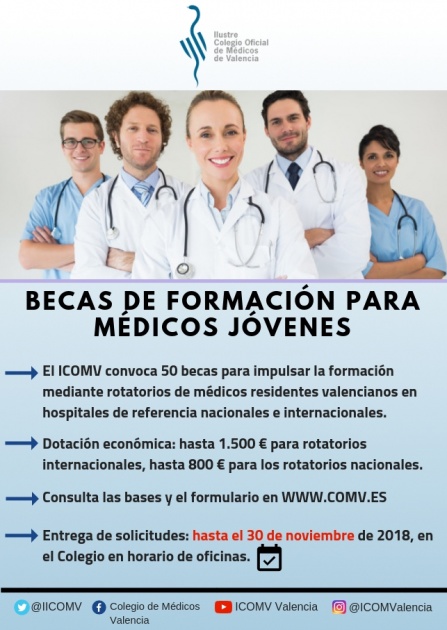 Médicos colegiados en el Colegio Oficial de Médicos de Valencia, con aceptación por escrito del Centro de destino, que se encuentren entre el 3er y 5º año de residencia con la debida autorización de la Comisión de Docencia de su Centro, o que hayan obtenido el título de Médico Especialista en los últimos dos años.