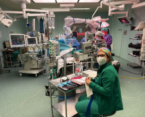 Mientras estudiaba la carrera conocí a un vecino que era anestesista y me invitó a acompañarle un día al hospital. Me gustó mucho la parte del quirófano, pero lo que más me llamó la atención de la anestesia fueron los cuidados críticos, el paciente complejo ingresado en una unidad de críticos, la reanimación… Tuve un buen número en el MIR, y fui la primera residente que eligió La Fe ese año (2001). Aquellos años de la residencia fueron fantásticos, cada día aprendías algo nuevo. Las guardias en Urgencias eran muy duras, pero el día a día del quirófano me dejó fascinada; mi primer rotatorio en la especialidad fue con niños. Recuerdo especialmente la primera vez que vi una anestesia raquídea. Era como magia, y eso demuestra la trascendencia que tiene la anestesia.