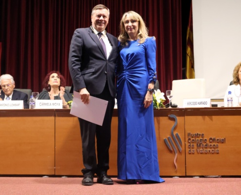 El acto comenzó con la entrega del Premio a la Mejor Tesis Doctoral del Curso 2022-2023, a cargo de la Fundación del ICOMV y ASCIRES. Este año, el ganador ha sido el Dr. Carlos Alventosa Mateu, por su tesis titulada “Alteraciones hepáticas en la infección por Covid-19 y sus implicaciones clínicas y pronósticas: estudio retrospectivo”. El premio fue entregado por la presidenta de la Fundación del ICOMV, la Dra. Mercedes Hurtado, junto a la CEO de Ascires, Lorena Saus.