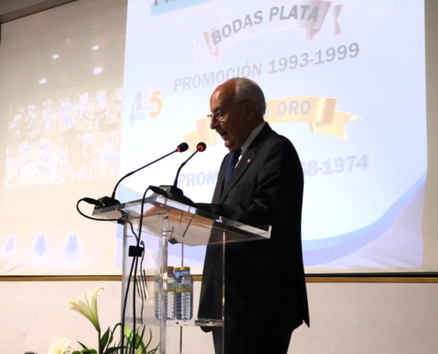 En cuanto a la promoción de las Bodas de Oro: “Uno de los mejores momentos de cada año es poder departir con vosotros en esta velada. Escuchar a compañeros que habéis vivido en primera persona la evolución de la Medicina durante estos 50 últimos años. Habéis protagonizado el avance de la ciencia y la Medicina, en pro de nuestros pacientes, nuestro motor. Voy a tomarme la licencia de hablar en nombre de todos los presentes para deciros en alto y bien fuerte: Gracias por una vida dedicada a las personas. Gracias por una vida empleada en cuidarnos, sanarnos y protegernos. Gracias por sacrificar tanto tiempo en formaros, en reciclaros. En estudiar, leer y aprender. Gracias por los sacrificios que habéis llevado a cabo, por las renuncias que todo médico debe asumir en algún momento. Gracias por todo ese esfuerzo, porque gracias a vosotros vivimos hoy en una sociedad mejor“, concluyó.