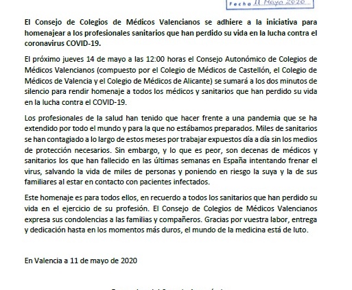 Por ello, el próximo jueves 14 de mayo a las 12:00 horas el ICOMV y el Consejo Autonómico de Colegios de Médicos Valencianos (compuesto por el Colegio de Médicos de Castellón, el Colegio de Médicos de Valencia y el Colegio de Médicos de Alicante) se sumarán a esta campaña y guardarán dos minutos de silencio para rendir homenaje a todos los médicos y sanitarios que han perdido su vida en la lucha por combatir el COVID-19.
