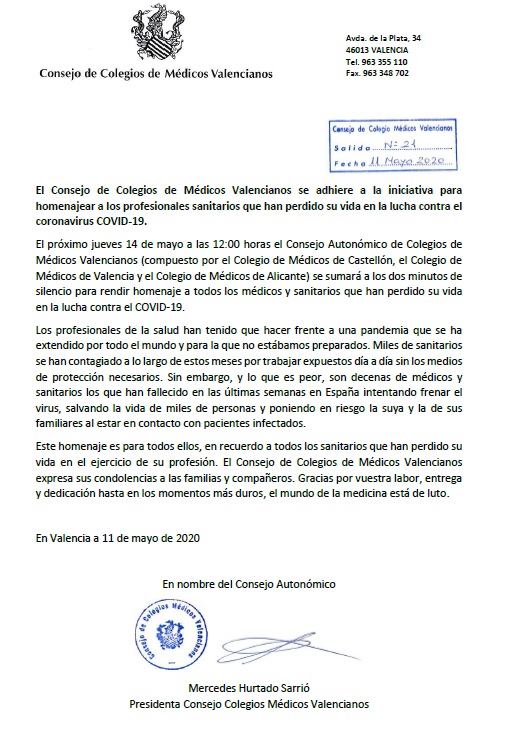 El Consejo de Colegios de Médicos Valencianos ha elaborado un manifiesto adhiriéndose a esta iniciativa y ha mostrado sus condolencias a las familias. Como afirman en el manifiesto “Gracias por vuestra labor, entrega y dedicación hasta en los momentos más duros, el mundo de la medicina está de luto.”