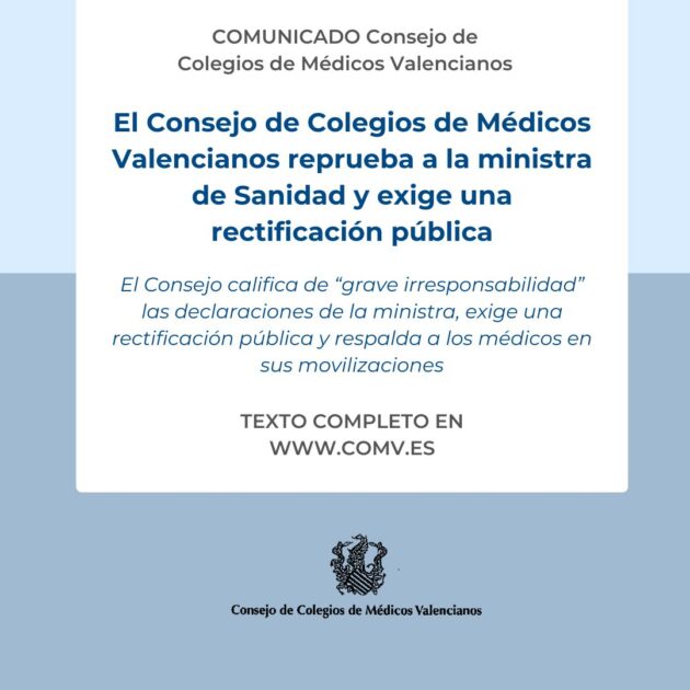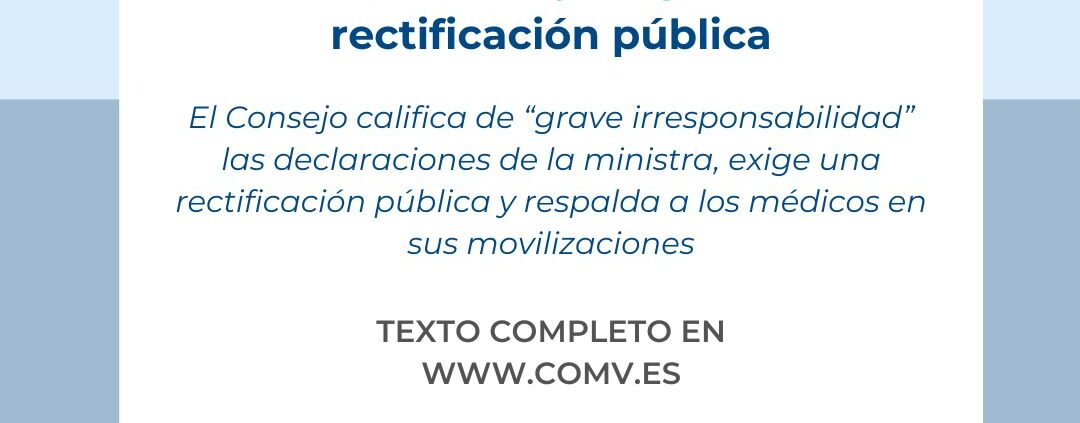 - Desde el Consejo de Colegios de Médicos Valencianos, Sra ministra, le exigimos una rectificación pública de sus declaraciones, dado que la utilización de afirmaciones no contrastadas contribuye a deteriorar la confianza de la ciudadanía en el sistema sanitario y en sus profesionales.