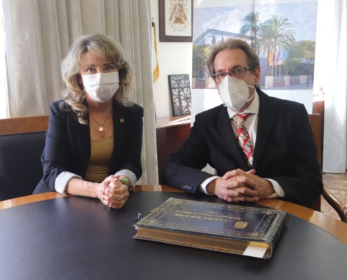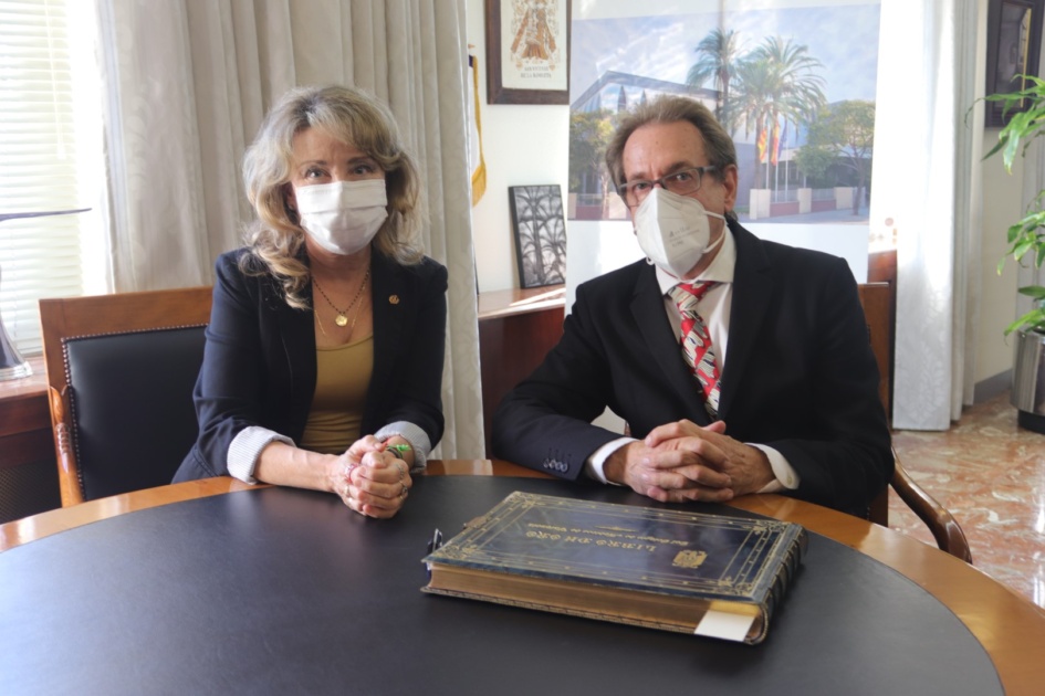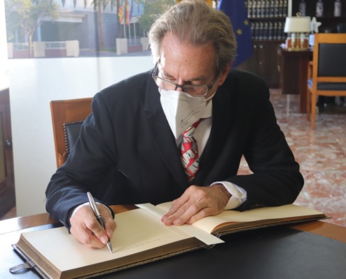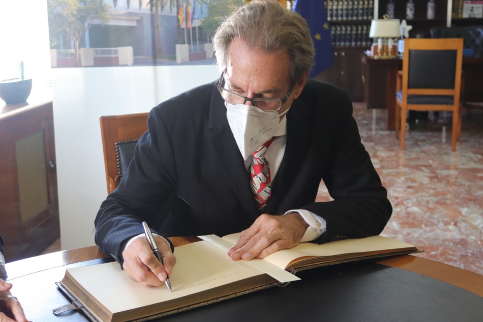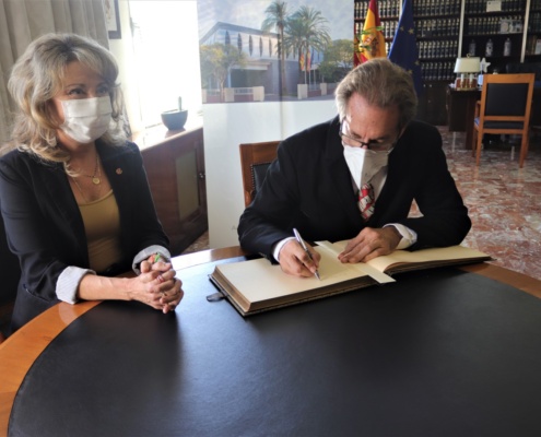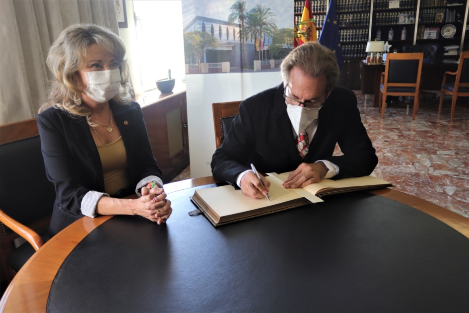 El conseller Mínguez ha firmado en el Libro de Honor del ICOMV y ha recibido la insignia colegial de manos de la presidenta del Colegio de Médicos, la doctora Mercedes Hurtado.