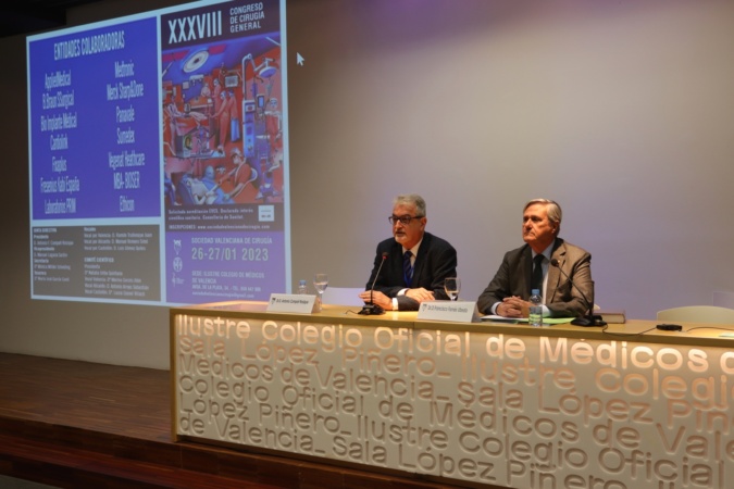 El doctor Francisco Fornés, consejero de la Junta de Gobierno del ICOMV, y el doctor Antonio Compañ, presidente de la Sociedad Valenciana de Cirugía, han sido los encargados de inaugurar el congreso que, durante dos días, reunirá a varios centenares de cirujanos de toda la Comunitat Valenciana en la sede colegial.