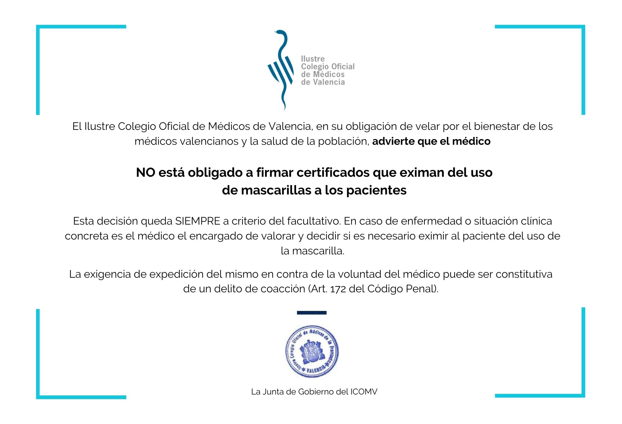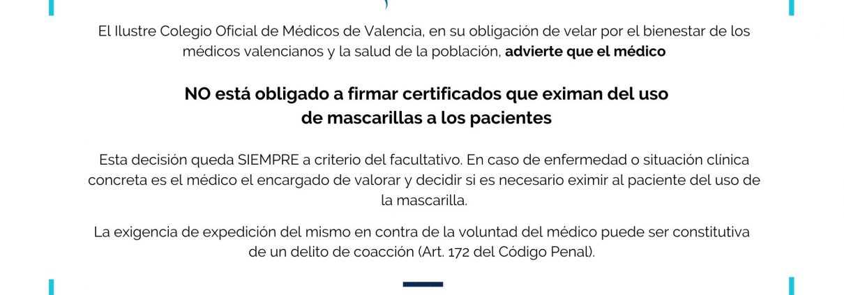 Ante las últimas situaciones que se están produciendo de forma reiterada en los hospitales y centros de Salud, en las que el paciente exige al médico con malas formas que le firme el certificado que le exima del uso de la mascarilla, el Ilustre Colegio Oficial de Médicos de Valencia ha elaborado este cartel para informar a los pacientes de que el médico NO está obligado a hacerlo y que forzar al facultativo puede suponer un delito de coacción.