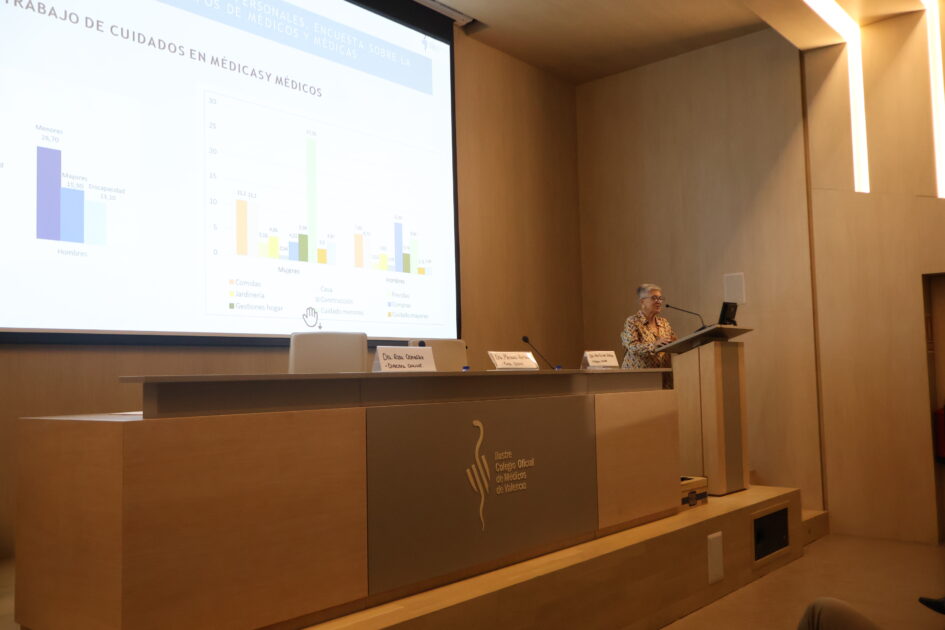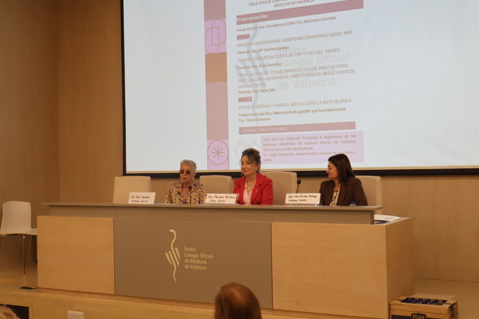 La jornada se estructuró en dos mesas de debate. La primera, titulada “Médicas valencianas: rompiendo barreras desde 1889”, contó con la intervención de la Dra. Mª Carmen Gallego, quien realizó un recorrido por la historia de las primeras médicas en la Comunidad Valenciana y el impacto que han tenido en el desarrollo de la profesión. A continuación, la Dra. Rosa González presentó los resultados de la encuesta realizada por la Organización Médica Colegial sobre conciliación y uso del tiempo en el ámbito sanitario, aportando datos reveladores sobre la situación actual. También expuso los hallazgos de un estudio sobre el conocimiento y uso de prestaciones para la conciliación en el ámbito médico, poniendo de manifiesto las dificultades que aún enfrentan muchas profesionales para compatibilizar su carrera con la vida personal y familiar.
