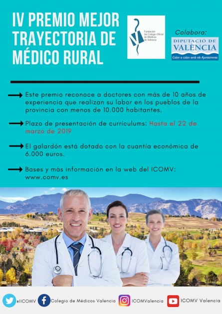 La Fundación del Ilustre Colegio Oficial de Médicos de Valencia presenta su convocatoria del IV Premio al Mejor Profesional de Atención Primaria en el Medio Rural, con el patrocinio de la Excelentísima Diputación Provincial de València.
