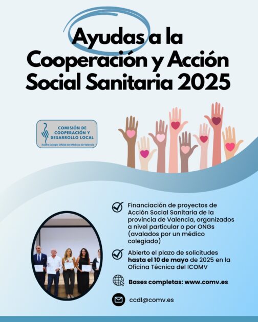 El Ilustre Colegio Oficial de Médicos de Valencia (ICOMV), a través de su Comisión de Cooperación y Desarrollo Local, abre la convocatoria de las Ayudas a la Cooperación y Acción Social Sanitaria 2025, con el objetivo de apoyar programas, proyectos y actividades que promuevan la salud tanto a nivel nacional como internacional, con especial atención al ámbito provincial.