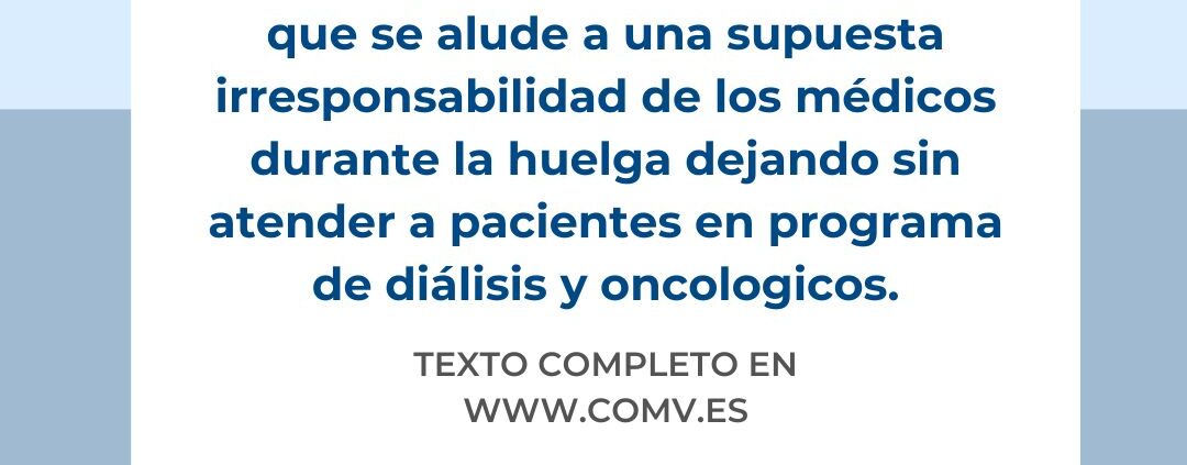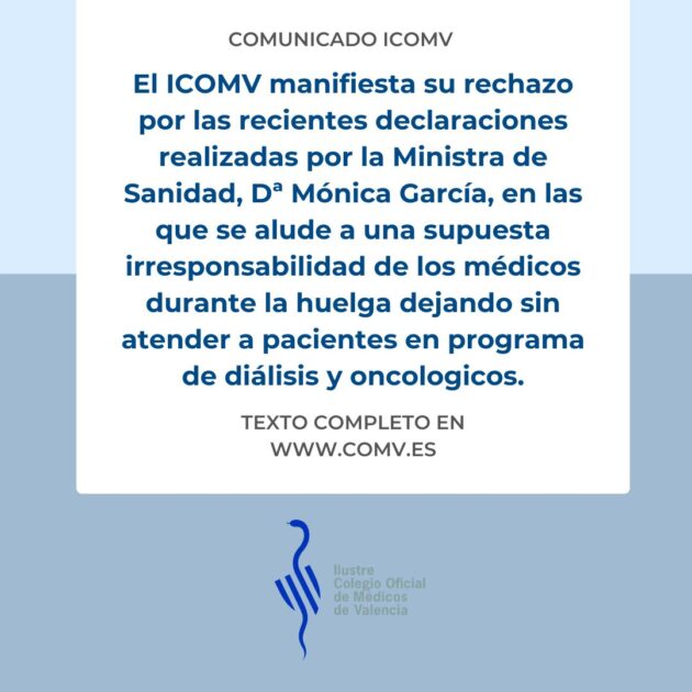 Desde el Ilustre Colegio de Médicos de Valencia, su Presidenta y la Junta Directiva desean manifestar su rechazo por las recientes declaraciones realizadas por la Ministra de Sanidad, Dª Mónica García, en las que se alude a una supuesta irresponsabilidad de los médicos durante la huelga dejando sin atender a pacientes en programa de diálisis y oncologicos.