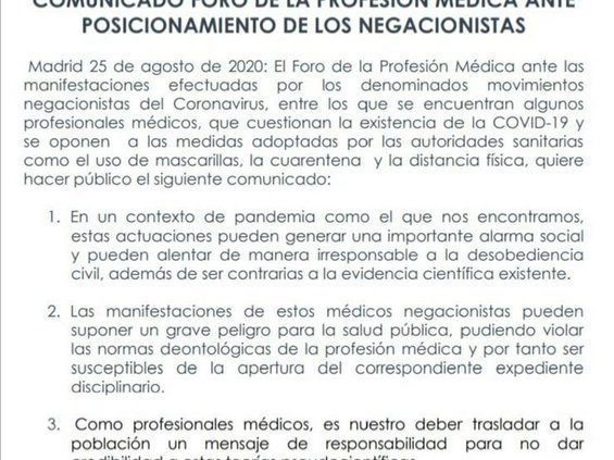 El Ilustre Colegio Oficial de Médicos de Valencia se adhiere al comunicado del Foro de la Profesión Médica ante las manifestaciones de los movimientos negacionistas del coronavirus COVID19