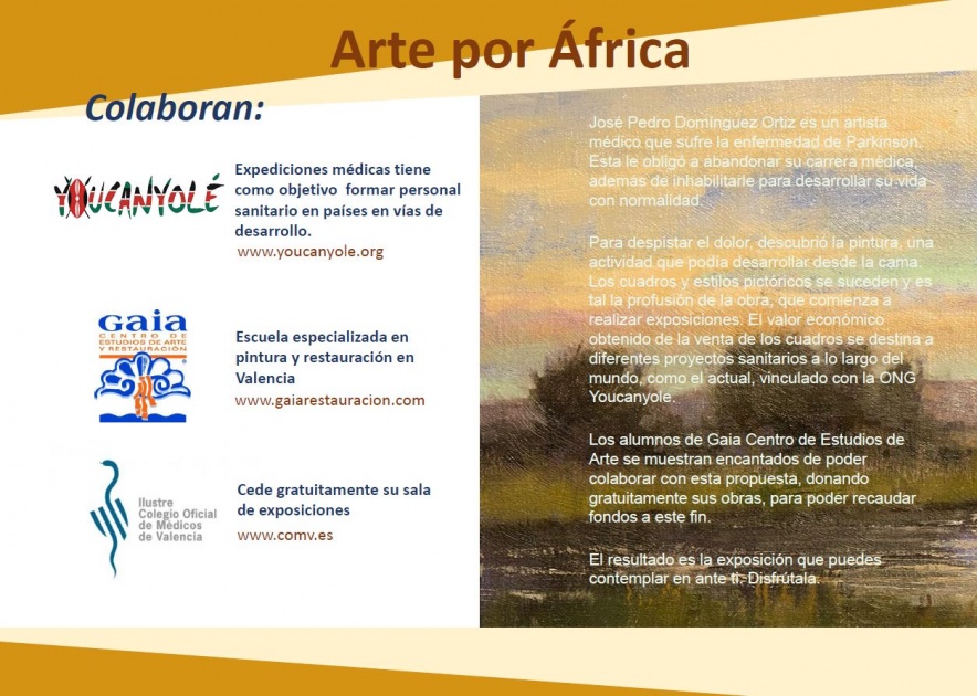 Arte por África – Exposición benéfica Publicado el 17 de febrero del 2020 a las 16:13 horas Calendar Añadir al Calendario Añadir a Timely Calendar Añadir a Google Agregar a Outlook Agregar a Apple Calendar Agregar a otro calendario Export to XML Cuando: 10 de marzo del 2020 a las 19:30 Europe/Madrid Zona Horaria2020-03-10T19:30:00+01:002020-03-10T19:45:00+01:00Donde: Ilustre Colegio Oficial de Médicos de Valencia Avinguda de la Plata 34, 46013 València, Valencia España /por ICOMV-vm https://www.comv.es/wp-content/uploads/2020/02/Arte-por-África.jpg 915 1213 ICOMV-vm https://www.comv.es/wp-content/uploads/2019/03/logo-icomv-300x200.jpg ICOMV-vm2020-02-17 16:13:022020-02-17 16:13:02Arte por África - Exposición benéfica