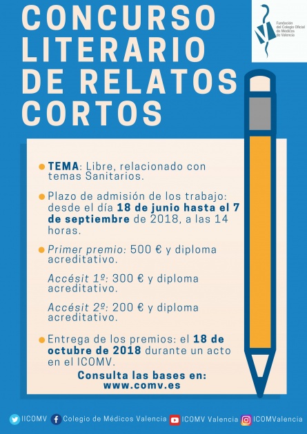 Entrega premios Concurso literario de relatos cortos Publicado el 20 de junio del 2018 a las 13:33 horas Calendar Añadir al Calendario Añadir a Timely Calendar Añadir a Google Agregar a Outlook Agregar a Apple Calendar Agregar a otro calendario Export to XML Cuando: 18 de octubre del 2018 a las 19:00 Europe/Madrid Zona Horaria2018-10-18T19:00:00+02:002018-10-18T19:15:00+02:00Donde: Colegio de Médicos de Valencia Avinguda de la Plata 20, 46013 València, Valencia España/0 Comentarios/por ICOMV-cm https://www.comv.es/wp-content/uploads/2018/06/CONCURSO-RELATOS-CORTOS-2018-2.jpg 2246 1588 ICOMV-cm https://www.comv.es/wp-content/uploads/2019/03/logo-icomv-300x200.jpg ICOMV-cm2018-06-20 13:33:392018-10-10 13:57:49Entrega premios Concurso literario de relatos cortos