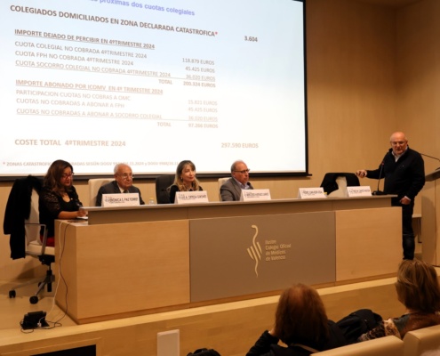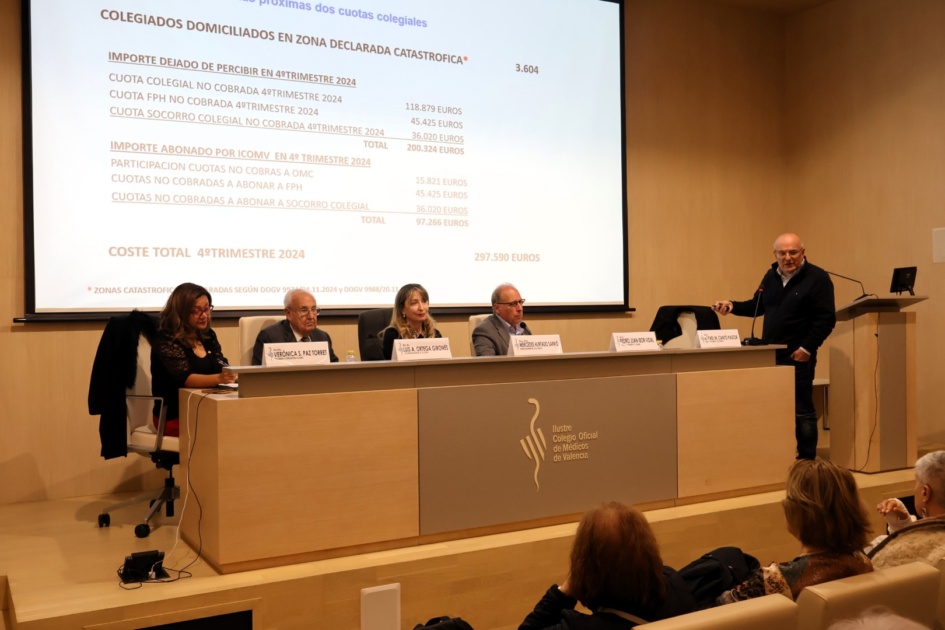 El secretario del ICOMV informó también de las medidas que ha tomado el Colegio con motivo de la DANA sufrida el pasado 29 de octubre. Una batería de medidas por un valor superior a los 600.000 euros, y que han alcanzado a más de 3.600 médicos que viven en las zonas afectadas.