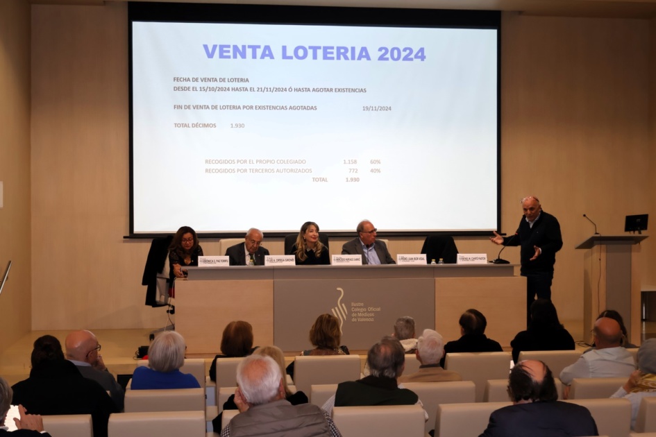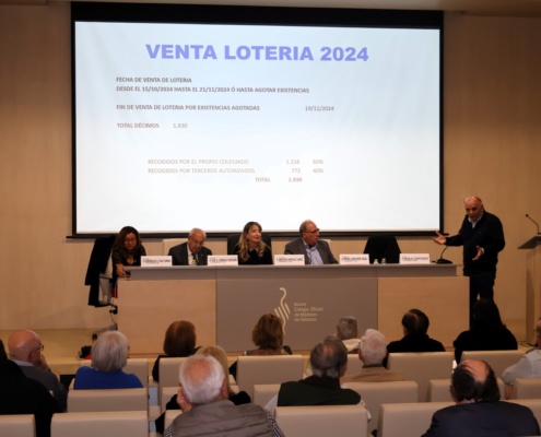 Por último, se informó también de cómo había funcionado el nuevo sistema de venta de Lotería de Navidad impulsado por la Junta de Gobierno, tras los incidentes de los últimos dos años, en los que las participaciones se agotaron en cuestión de horas. Se decidió que sólo se podría adquirir un décimo por colegiado en un primer periodo (de 15 de octubre a 21 de noviembre), hasta que se agotaran existencias. En caso de sobrar lotería, se abriría un segundo plazo de venta sin restricciones. Este segundo periodo no fue necesario, dado que los 1.930 décimos del número 62.690 se agotaron el 19 de noviembre. De ellos, el 60% fueron recogidos por el propio colegiado, y el 40% por personas autorizadas según las normas establecidas.