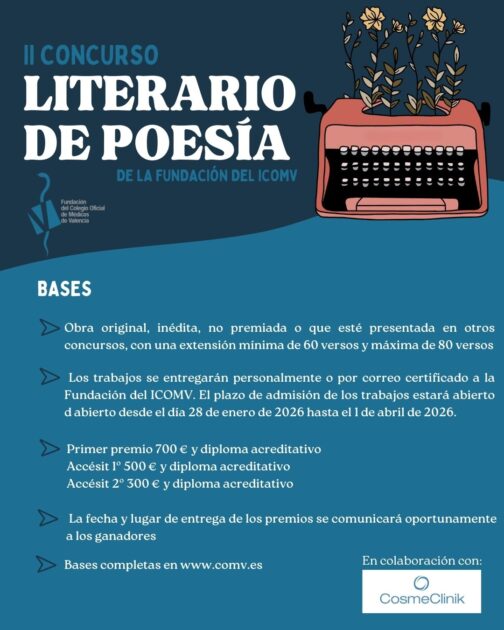 La Fundación del Ilustre Colegio Oficial de Médicos de Valencia (ICOMV) ha convocado el II Concurso Literario de Poesía, una iniciativa dirigida a médicos colegiados que refuerza el compromiso del Colegio con la promoción de la cultura y la dimensión humanística de la medicina.