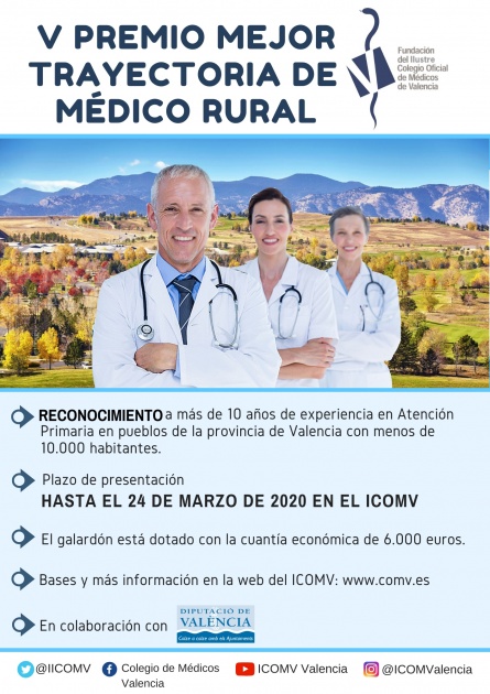 La Fundación de Ilustre Colegio Oficial de Médicos de Valencia convoca, un año más, el V Premio al Mejor Profesional de Atención Primaria en el Medio Rural con el patrocinio de la Excelentísima Diputación Provincial de València.