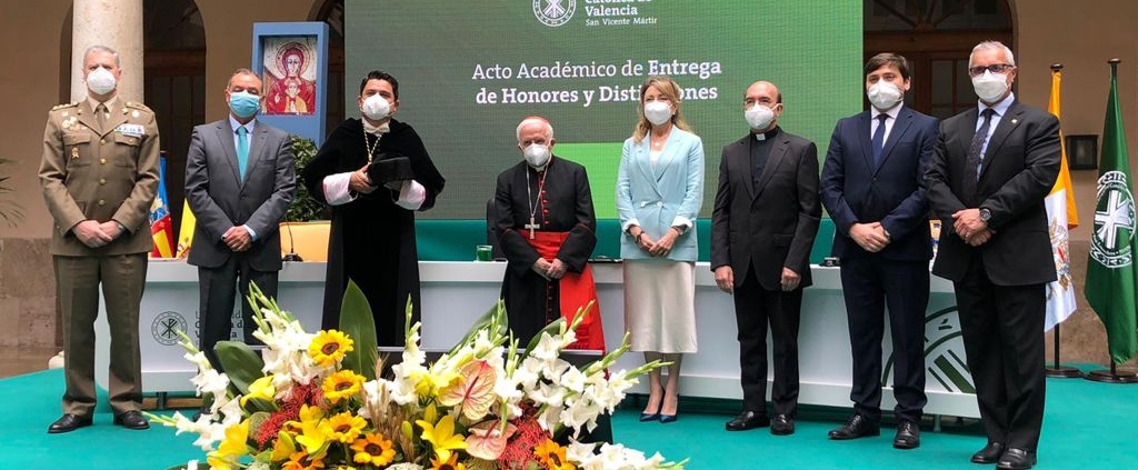 El Ilustre Colegio Oficial de Médicos de Valencia (ICOMV) recibió el viernes 28 de mayo, la Medalla de Oro de la Universidad Católica de Valencia San Vicente Mártir, en reconocimiento a la gran labor de tantas/os médicas/os que han estado y siguen estando al servicio de las personas durante la crisis sanitaria derivada de la pandemia.