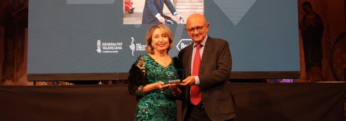 La presidenta del ICOMV, Dra. Mercedes Hurtado, fue invitada a participar en la ceremonia como representación institucional al sector sanitario. Durante la gala, la Dra. Hurtado hizo entrega del Premio Promoción de Hábitos de Vida Saludable al Dr. José Viña, catedrático y director de la Cátedra de Gerociencia, destacando el valor de su trayectoria y su aportación a la mejora de la salud pública.