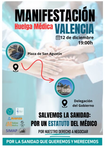 El Ilustre Colegio Oficial de Médicos de Valencia (ICOMV) se adhiere a la convocatoria de manifestación del próximo 12 de diciembre, cuyo objetivo es reivindicar la necesidad de un Estatuto del Médico y la mejora de las condiciones del ejercicio profesional.