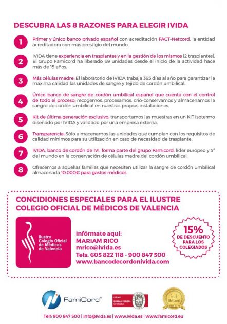IVIDA es un banco de células madre y ofrece un 15% de descuento a colegiados, puedes consultar toda la información en https://www.bancodecordonivida.com/