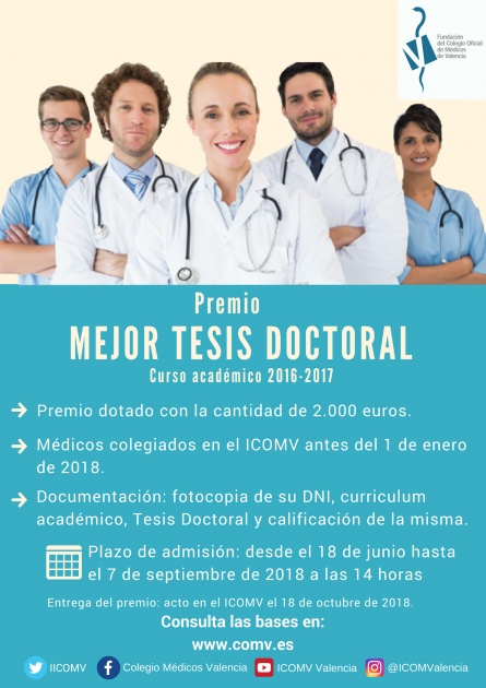 Por otro lado, la Fundación también ha habierto el plazo de admisión para optar a conseguir el Premio Mejor Tesis Doctoral. Podrán entregar la documentación los médicos colegiados en el ICOMV antes del 1 de enero de 2018 hasta el 7 de septiembre.