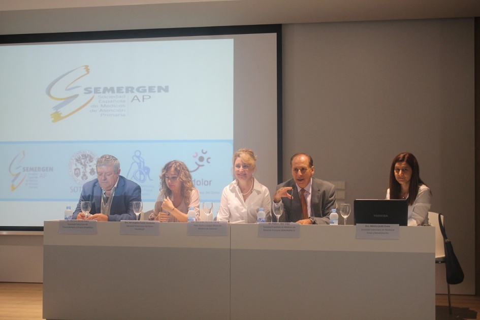 La presentació d’este manual per a professionals ha sigut inaugurada per la presidenta del Col·legi de Metges, Dra. Mercedes Hurtado i ha comptat amb la participació del doctor Pedro J. Ibor com a coordinador del grup de treball de Dolor per part de SEMERGEN, la doctora Mª Ángeles Canosos, presidenta de Societat Valenciana del Dolor, el doctor Marià Agranes, president de la Societat de Traumatologia i Cirurgia Ortopèdica CV, i la doctora Mónica Jordá, presidenta de la Societat Valenciana de Medicina Física i Rehabilitació.